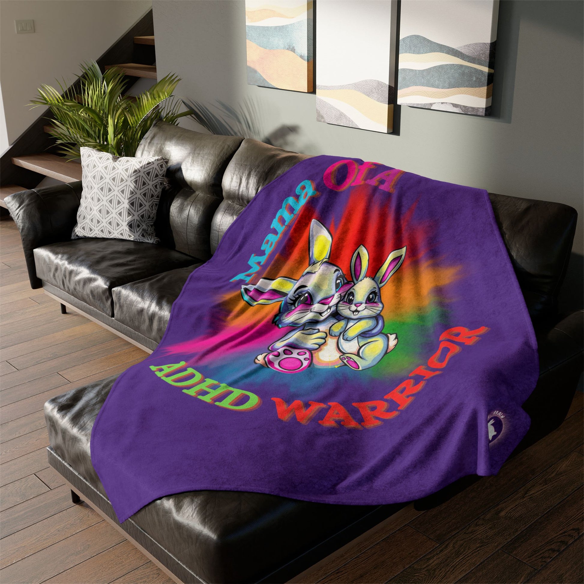 Colorful blanket with the words 'mama of a adhd warrior adhd awareness' printed on it. Soft, thick, and vibrant, this blanket is perfect for cozying up on the couch or as a decorative piece in a bedroom. Ideal for mothers of children with ADHD, this blanket is a great way to show support and raise awareness. Perfect for Mother's Day, World ADHD Awareness Day, or as a thoughtful gift for a special mom.
